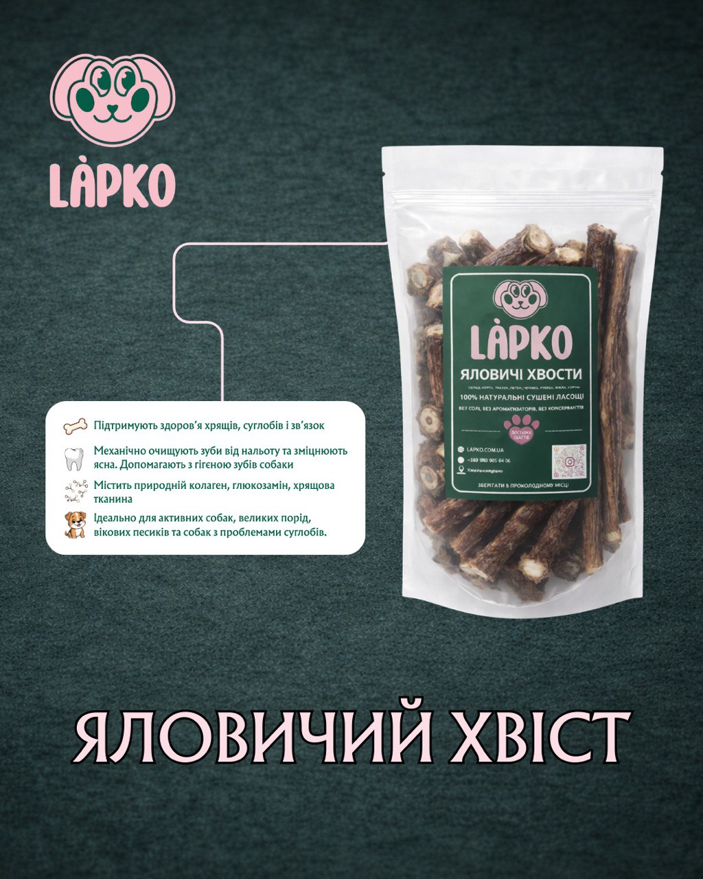 Склад: 100% хвіст яловичий (бережна сушка).