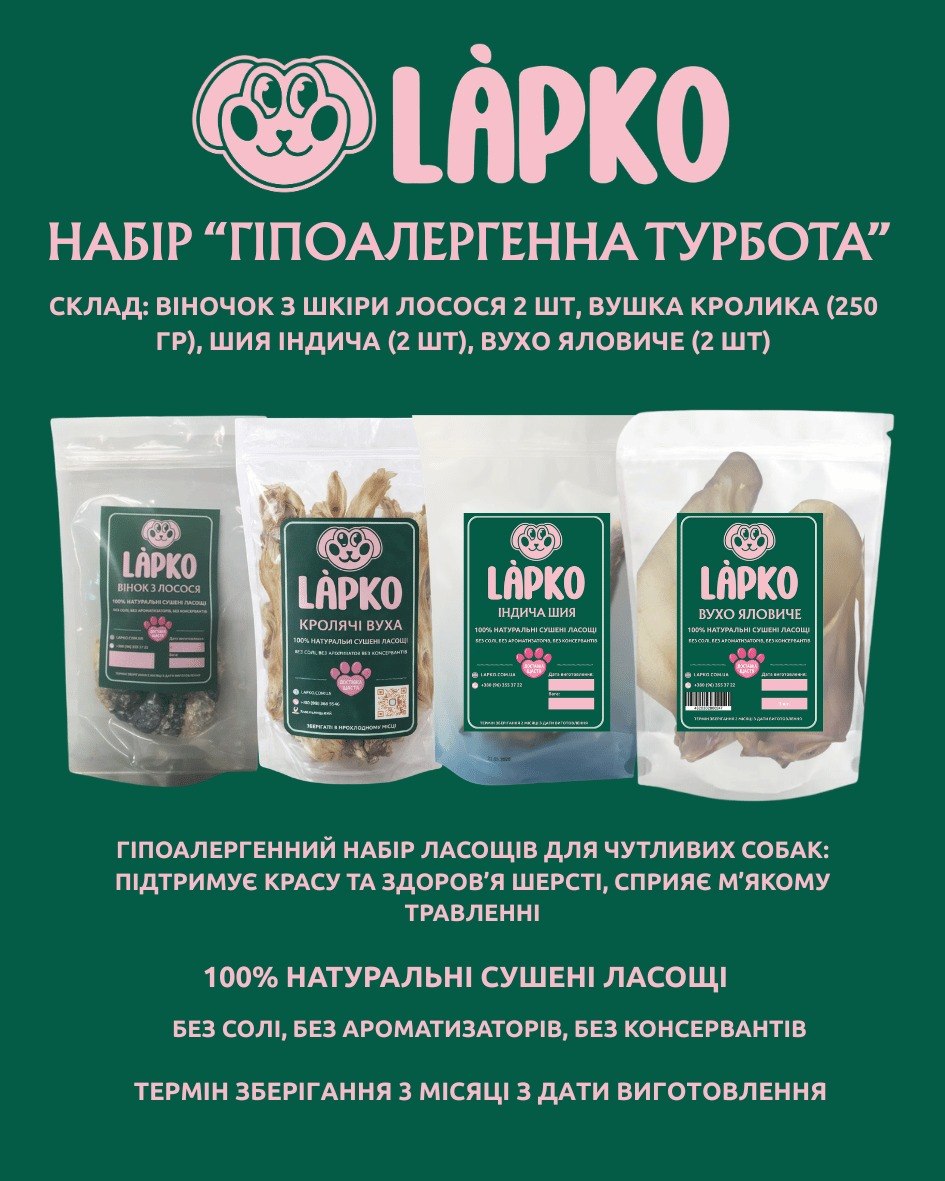 Шукаєте, чим пригостити собаку-алергіка? Набір від LAPKO створений для порід, схильних до висипань, свербежу та сльозоточивості очей (французькі бульдоги, бішони, мальтезе, самоїди). Ми прибрали всі сумнівні інгредієнти, залишивши лише чисту користь.
