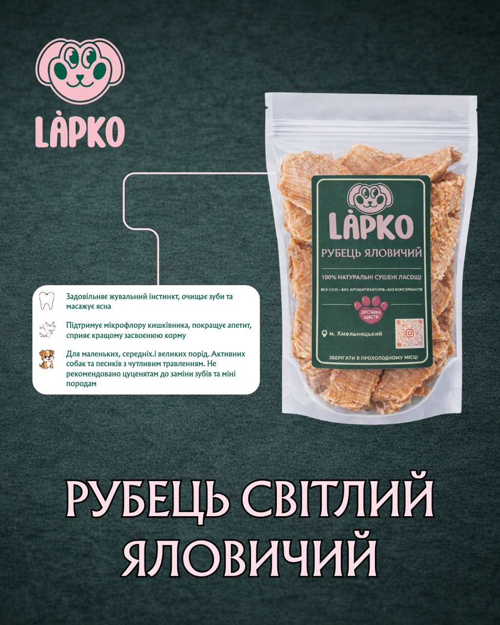Він виглядає охайно, не бруднить руки та підстилку улюбленця. Це ідеальні ласощі для щоденного заохочення, які підходять як для великих порід, так і для маленьких гурманів.