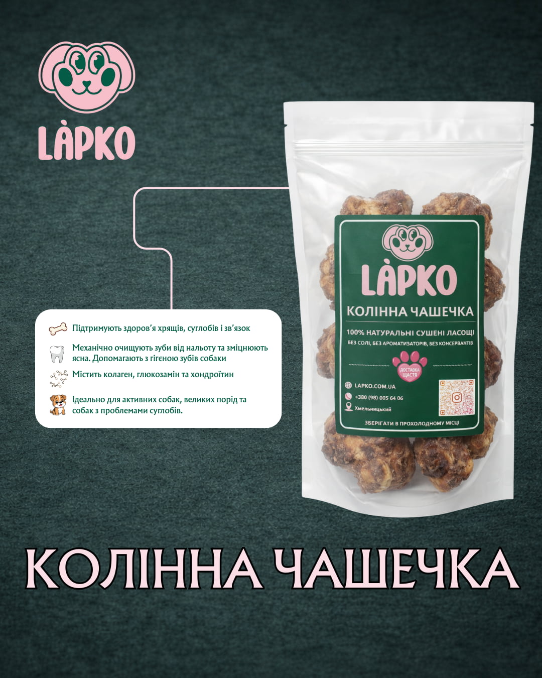 Природне джерело здоров’я: Надколінок багатий на ключові компоненти для суглобів: природний колаген, хондроїтин та глюкозамін.